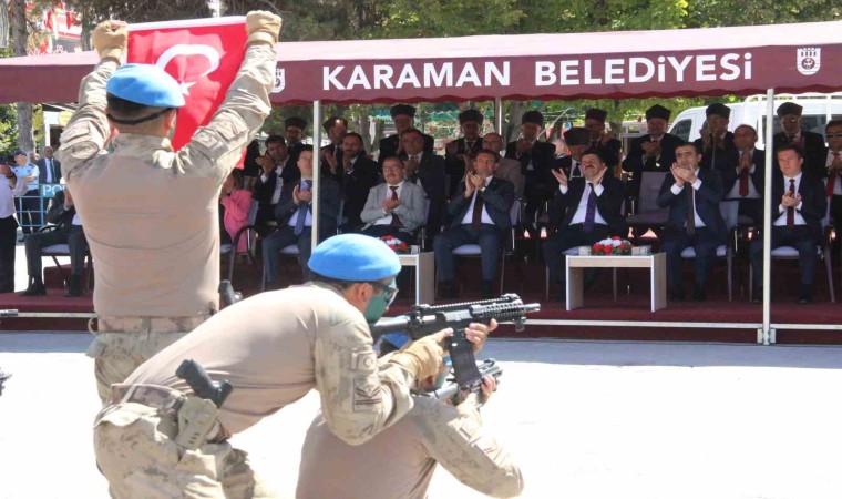 Kutlamalar Cumhuriyet Parkındaki Atatürk Anıtına çelenklerin koyulmasıyla başladı. Buradaki törene Karaman Valisi Hüseyin Engin Sarıibrahim, CHP Karaman Milletvekili İsmail Atakan Ünver, Belediye Başkanı Savaş Kalaycı, Cumhuriyet Başsavcısı Ali İhsan Akdoğan, Karamanoğlu Mehmetbey Üniversitesi Rektörü Prof. Dr. Mehmet Gavgalı, İl Emniyet Müdürü Ahmet Selçuk Okumuş, İl Jandarma Komutanı Kıdemli Albay Mustafa Çetinkaya, daire müdürleri, gaziler, siyasi parti temsilcileri ile askeri ve mülki erkan katıldı. Protokol üyeleri daha sonra resmi geçit töreninin yapılacağı Aktekke 15 Temmuz Demokrasi Meydanına geçti. Saygı duruşunda bulunulması ve İstiklal Marşı’nın okunmasıyla başlayan törende, günün anlam ve önemini belirten konuşmalar yapıldı. Karaman Jandarma Asayiş Komando Bölük Komutanlığının gösterisinin ardından resmi geçit töreni yapıldı.
