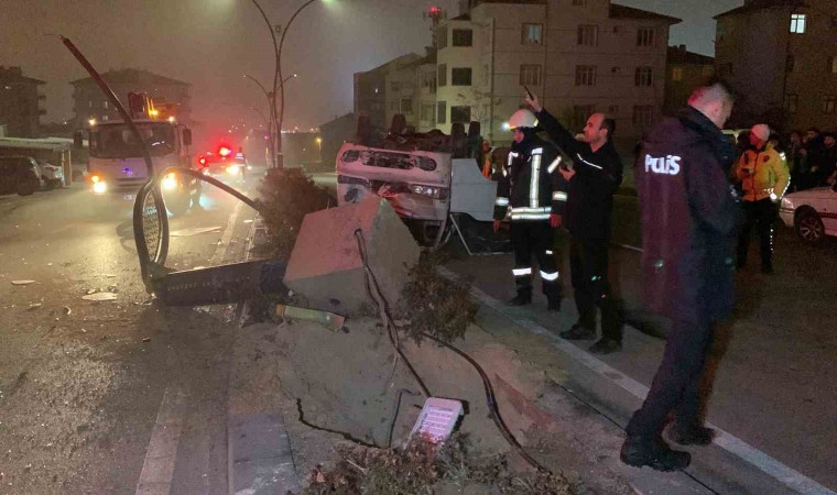 Karaman’da kontrolden çıkan minibüs, aydınlatma direğine çarparak takla attı. Kazada minibüs sürücüsü yaralandı.