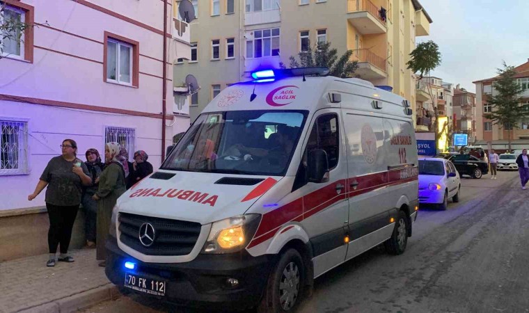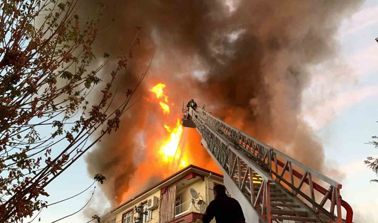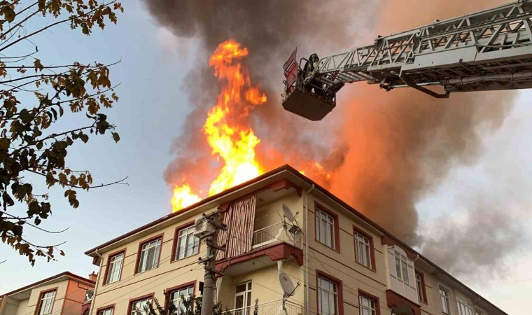 Karaman’da bir apartmanın çatısı çıkan yangında alev topuna dönerken, mahalleli sokağa döküldü.