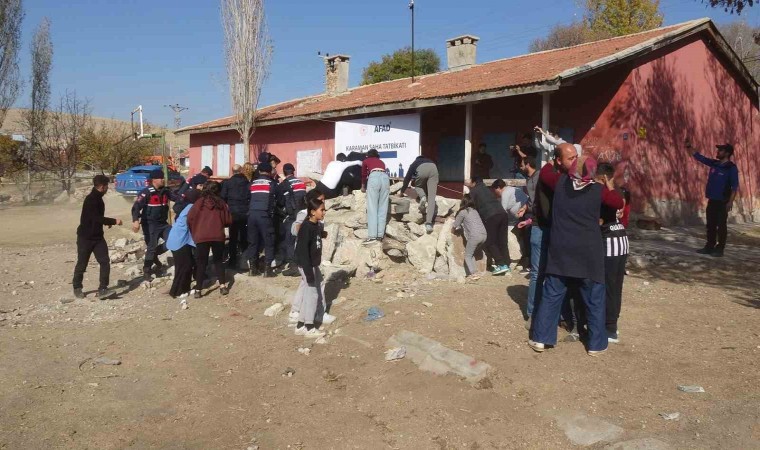 Karaman Valisi Mehmet Fatih Çiçekli ve Belediye Başkanı Savaş Kalaycı’nın da izlediği tatbikatta deprem senaryosunda rol alan köy halkının feryatları gerçeğini aratmadı. Karaman Afet ve Acil Durum Yönetimi İl Müdürlüğü (AFAD) tarafından yerel saha tatbikatı yapıldı. Merkeze bağlı Dereköy köy ilkokulu bahçesinde gerçekleşen tatbikatlar 3 ayrı vaka üzerine gerçekleşti. Tatbikatlarda AFAD, UMKE, Jandarma, Kızılay, İl Özel İdaresi, İtfaiye Müdürlüğü, Karaman Belediyesi, Cenaze Müdürlüğü ve 112 sağlık ekiplerinden oluşan toplam 217 personel ve 56 araç görev aldı. Eski Dereköy İlkokulu bahçesinde düzenlenen tatbikatlarda köy halkı da rol aldı. Senaryo gereği Dereköy merkezli 6.2 büyüklüğündeki depremde evler yıkılarak yerle bir oldu. Yıkılan bir evin yanına çocuklarıyla birlikte gelen kadın ve erkekler ağlayarak yakınları için gözyaşı döktü. Tatbikat sırasında rol alan köy halkı ilgiyle izlendi. Ekipler yıkılan evin enkazından bir kişiyi yaralı olarak kurtarırken, 1 kişinin de cesedini çıkardı. Deprem sonrası çıkan yangın ise itfaiye ekibi tarafından söndürülürken, kimyasal maddeden etkilenen bir kişi de özel kıyafetler giyen görevlilerce kurtarıldı. Başarıyla tamamlanan tatbikatın sonunda Vali Mehmet Fatih Çiçekli ve Belediye Başkanı Savaş Kalaycı, tatbikatta görev alan personelle birlikte fotoğraf çekindi.