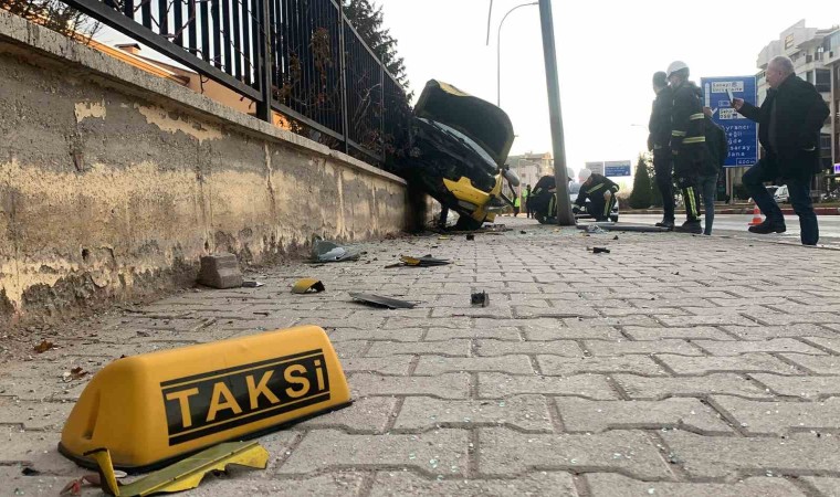 Karaman’da kayganlaşan yolda kontrolden çıkan ticari taksi önce aydınlatma direğine, sonra da duvara çarptı. Araç çarptığı duvarda asılı kaldı. Kazada yaralanan sürücü ambulansla hastaneye kaldırıldı.