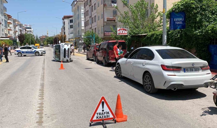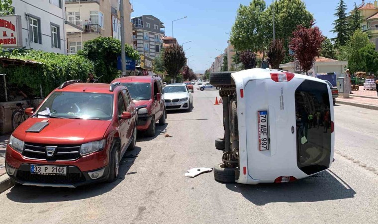 Karaman’da otomobil ile çarpıştıktan sonra park halindeki başka bir araca da çarparak kontrolden çıkan hafif ticari araç yol ortasına yan yattı. Kazada şans eseri yaralanan olmadı.
