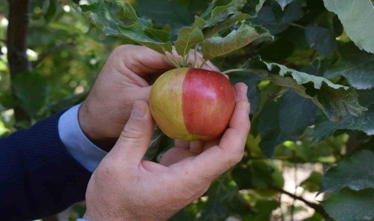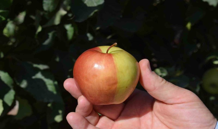 Karaman’da bir elma bahçesinde yetişen çift renkli elma görenleri şaşırtıyor.