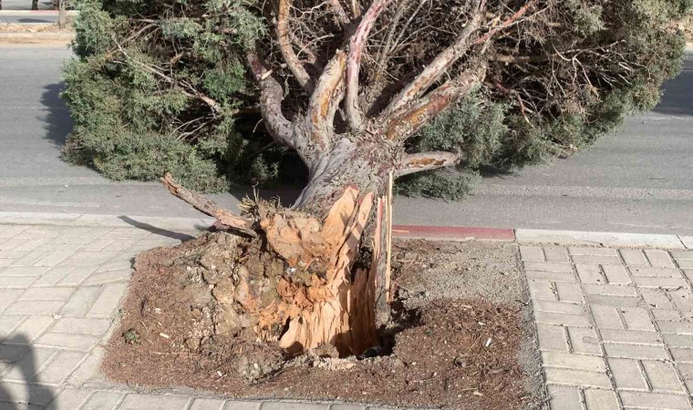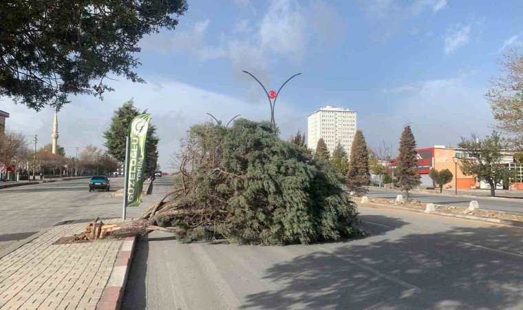 Karaman’da saatte hızı 50 kilometreye ulaşan şiddetli rüzgar hayatı olumsuz yönde etkilerken, bazı ağaçları kökünden kırdı.