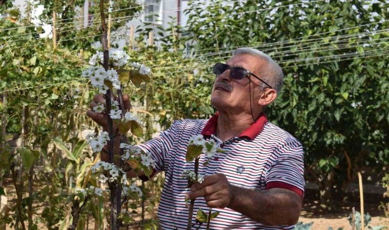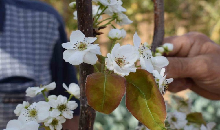 Karaman’da sonbaharda çiçek açan armut fidanı 45 yıllık fidancıyı şaşırttı. Normal şartlar altında ilkbahar aylarında çiçek açması ve yaz aylarında meyvelerinin toplanması gereken Naşi armudunun Eylül ayında çiçek açması görenleri şaşırttı.