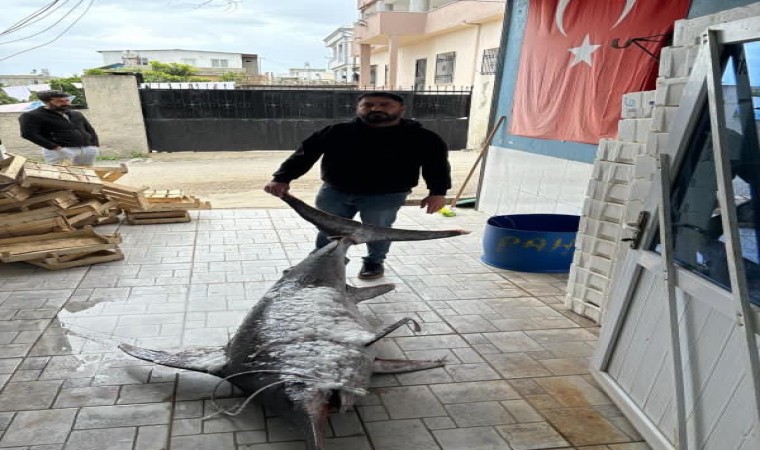 Adana’nın Karataş ilçesinde balıkçıların ağına 150 kiloluk kılıç balığı takıldı.