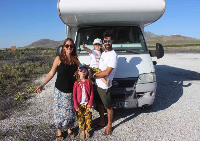 Karavanları ile dünya turuna çıkan Fransız aile Meke Gölünde kamp yaptı
