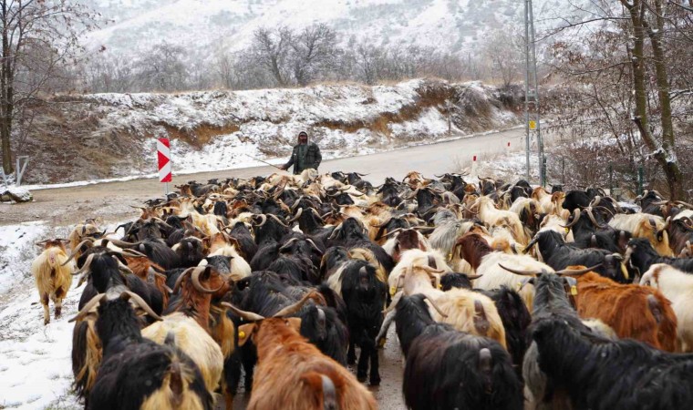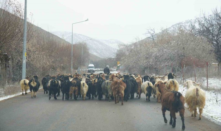 Erzincan’da araçların seyrettiği karayolunda ilerleyen keçi sürüsü ilginç görüntü oluşturdu.
