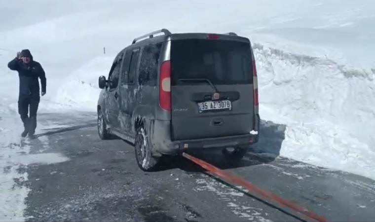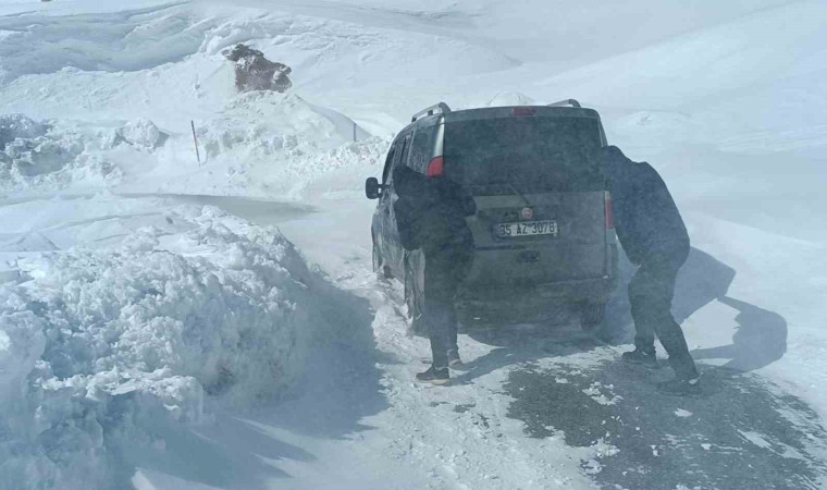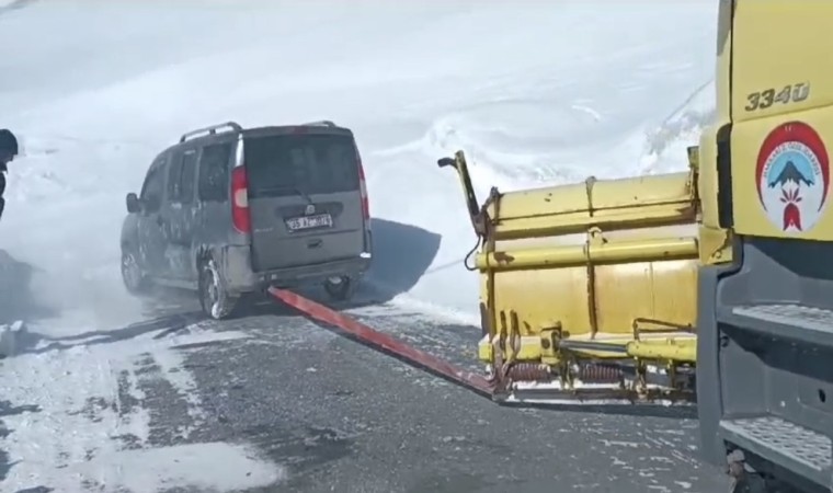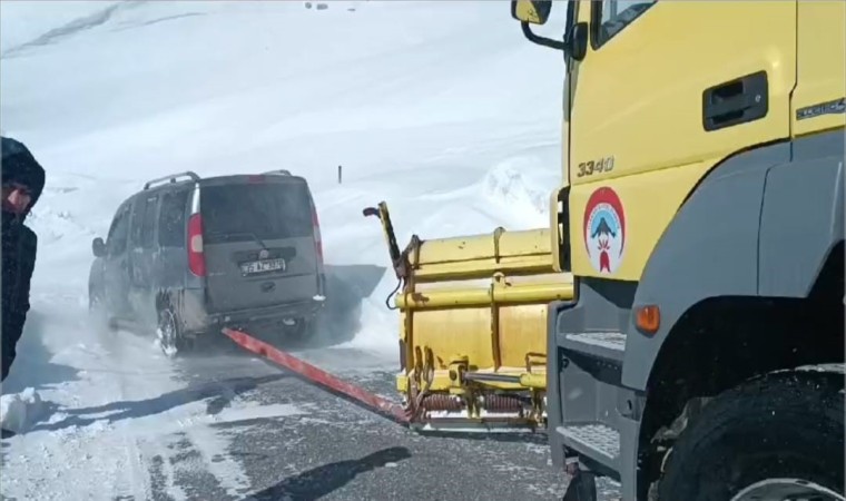 Hakkari’nin Durankaya beldesi yolunda fırtınanın etkisiyle karla kaplanan yolda mahsur kalan araç ve içerisindekiler, ekiplerin zorlu çalışmasıyla kurtarıldı.