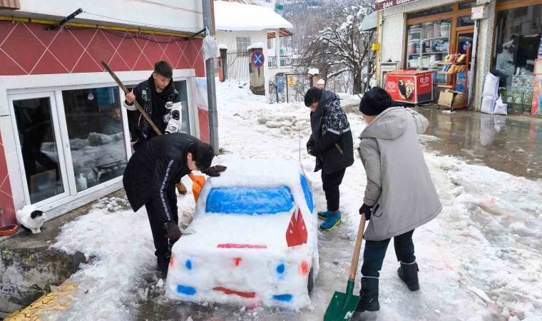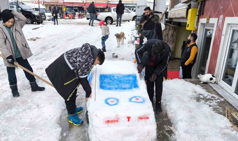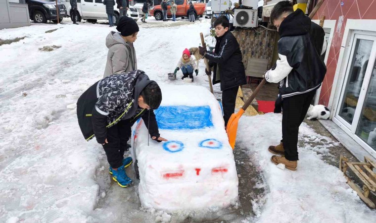 Artvin’in Şavşat ilçesinde ortaokul öğrencileri, kar yağdığında yaşıtları gibi kardan adam yapmak yerine kardan araba yaptılar.