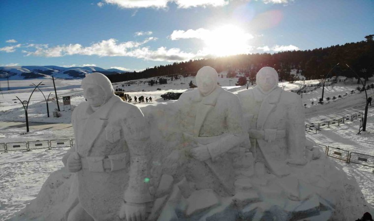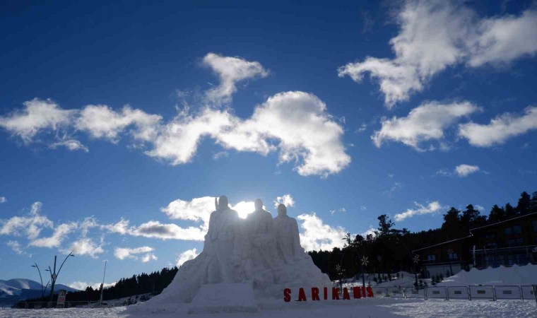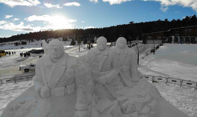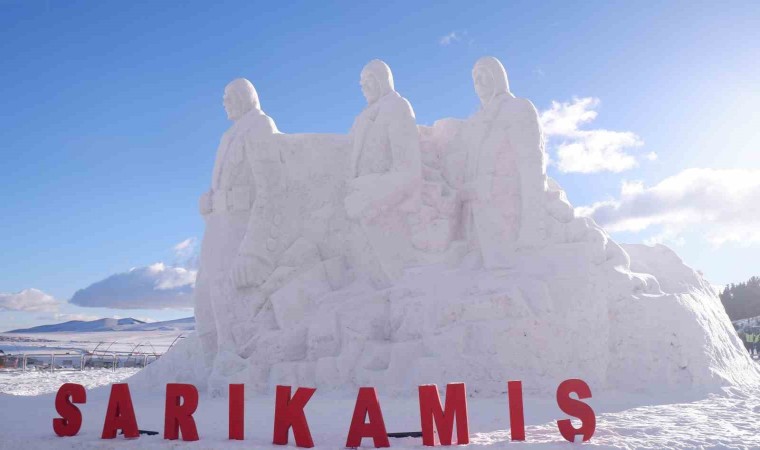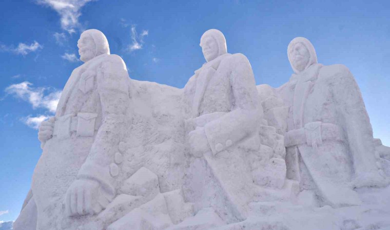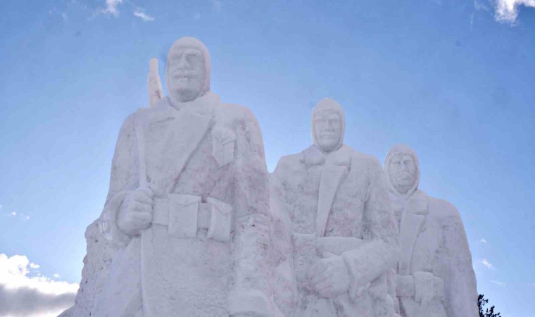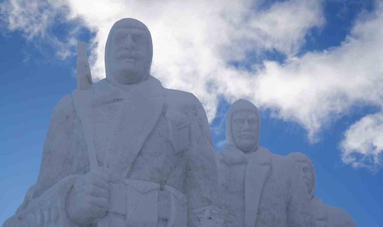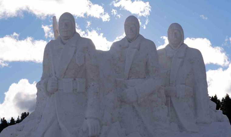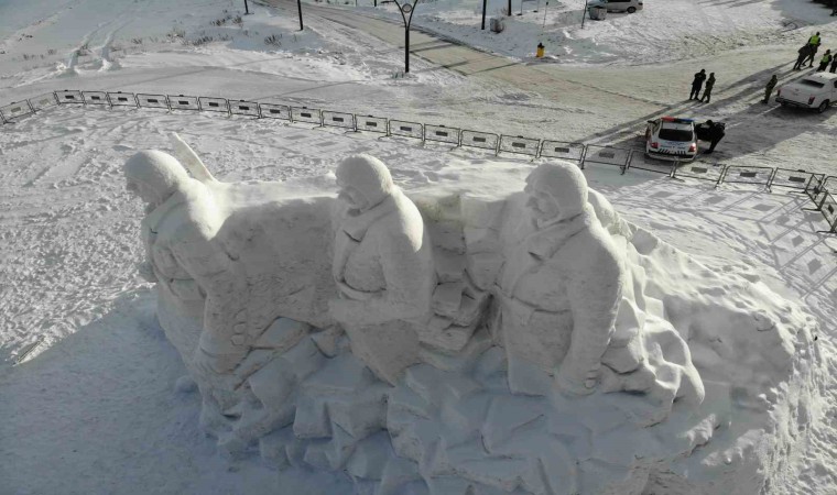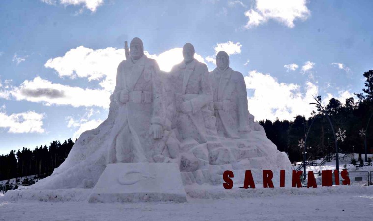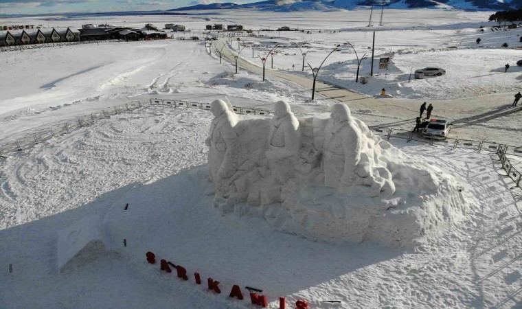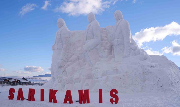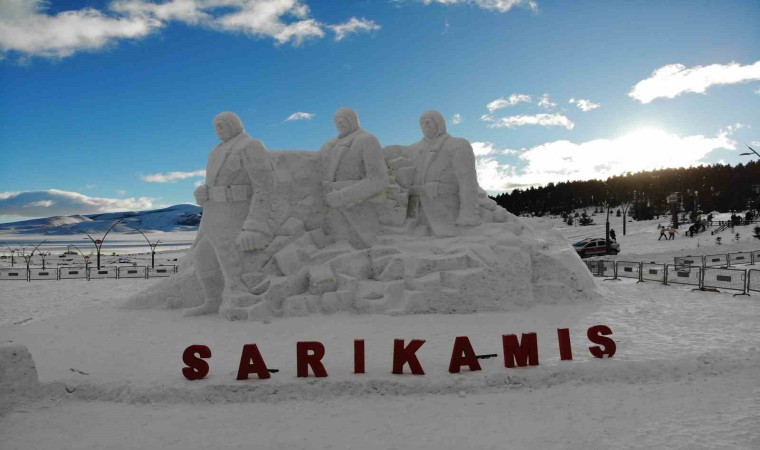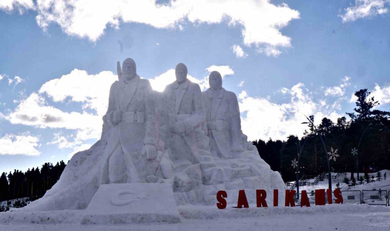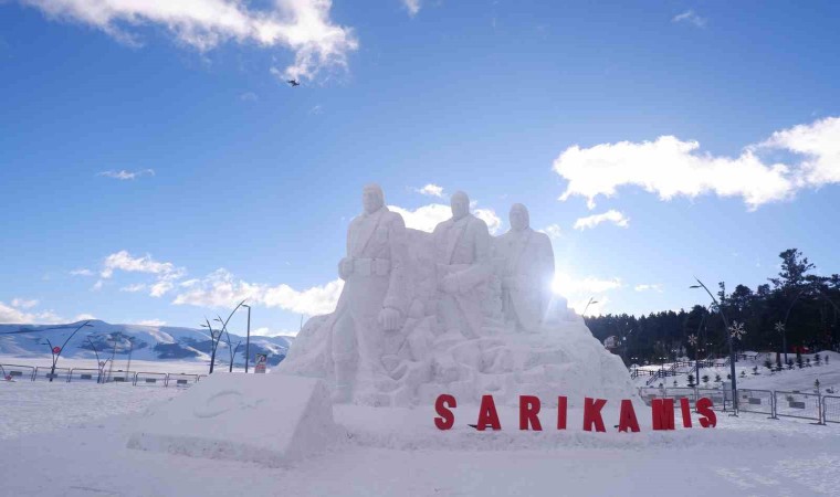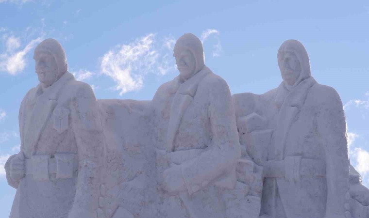Sarıkamış Kayak Merkezi’nde yaklaşık 15 kilometre uzaklıktan 200 kamyon kar taşınarak yapılan kardan şehit askerlerin heykellerinin yapımında 9 kişi görev aldı.