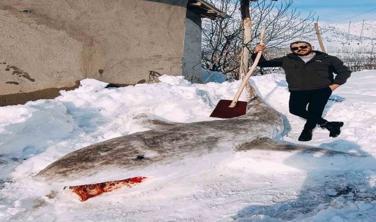 Hakkari’nin Şemdinli ilçesinde öğretmenlik yapan Mehmet Geylani kardan köpek balığı yaparken, ağzına da salçalı bir bez bırakarak et parçası görüntüsü oluşturdu.