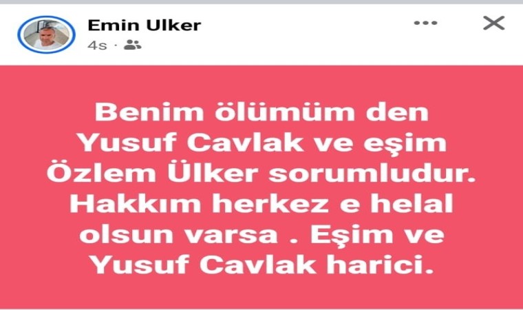 Olayın ardından bölgeden uzaklaşan koca Emin Ülker, 2 sokak ileride aynı silahla intihar etti. Emin Ülker’in bugün cinayet ve intiharıyla sonuçlanan olaydan uzun süre önce sosyal medyadan “Ölümümden Yusuf Cavlak ve eşim Özlem Ülker sorumludur. Hakkım varsa herkese helal olsun. Eşim ve Yusuf Cavlak hariç” şeklinde paylaşım yaptığı, Emin Ülker’in 30 Eylül’de yaptığı bu paylaşımı daha sonrasında ise sildiği ortaya çıktı.