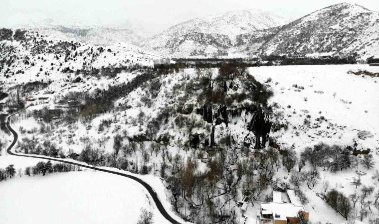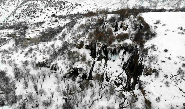 Erzincan’da etkili olan kar yağışı ile beyaza bürünen Girlevik Şelalesi’nde güzel manzaralar oluştu.