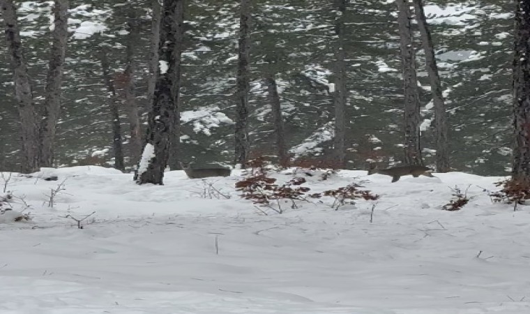 Kastamonu’da karla kaplanan ormanlık alanda görülen karacalar orman ekibi tarafından görüntülendi.