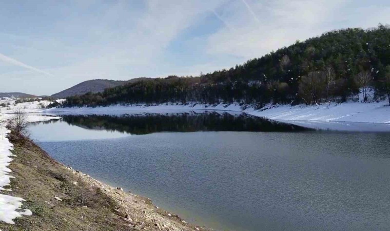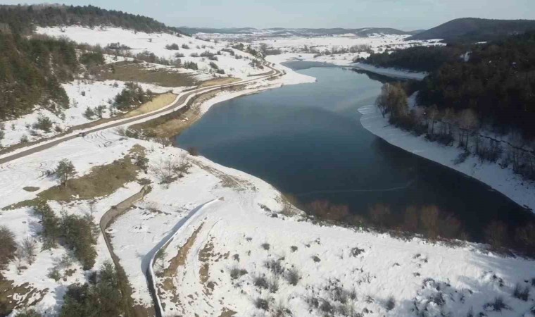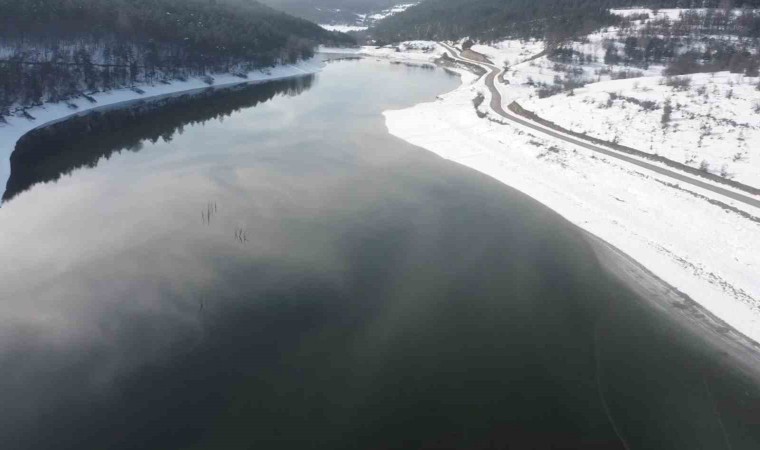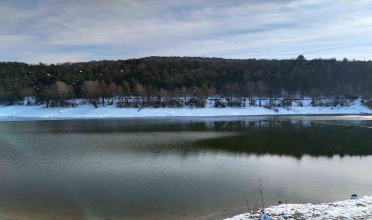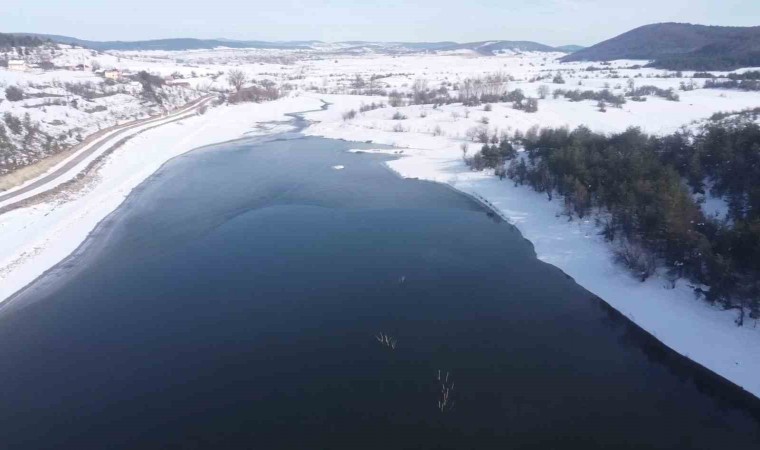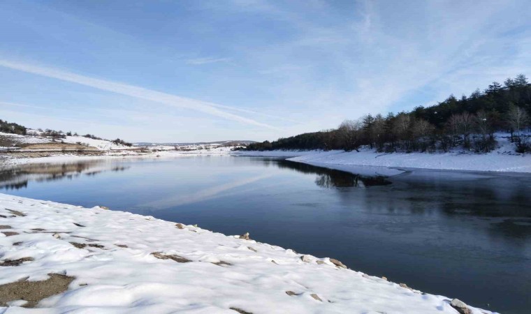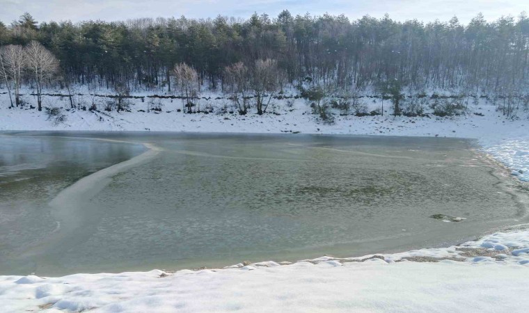 Beyaz örtüyle kaplı olan Karabük’ün Eflani ilçesindeki Kadıköy Göletinin bir kısmı soğuk hava nedeniyle dondu.