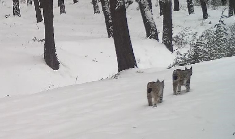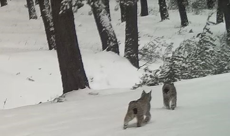 Görüntülerde, karla kaplı arazide gezinen 2 vaşağın yürüyerek ormanın derinliklerine doğru gözden uzaklaşması yer alıyor.