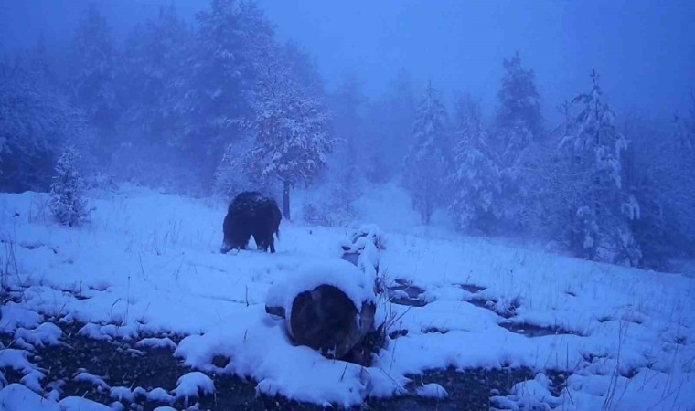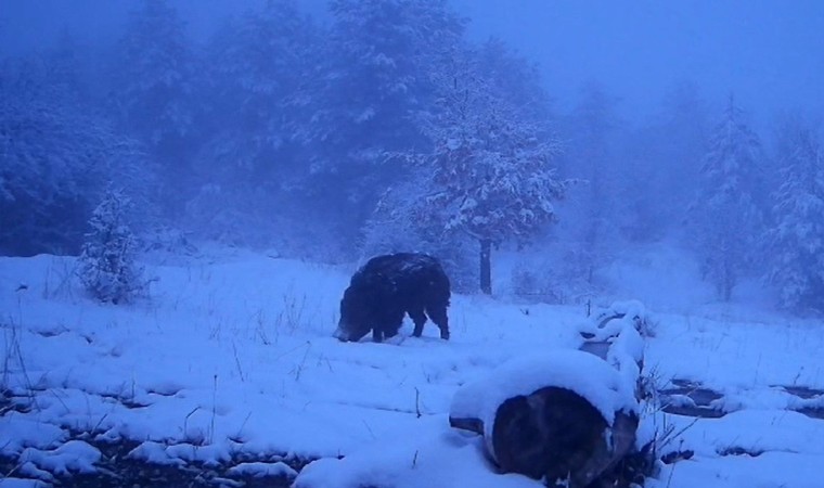 Eskişehir’de ormanlık alana kurulan fotokapan tarafından, bir yaban domuzunun karlı havada yemek arama anları saniye saniye kaydedildi.