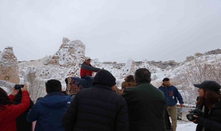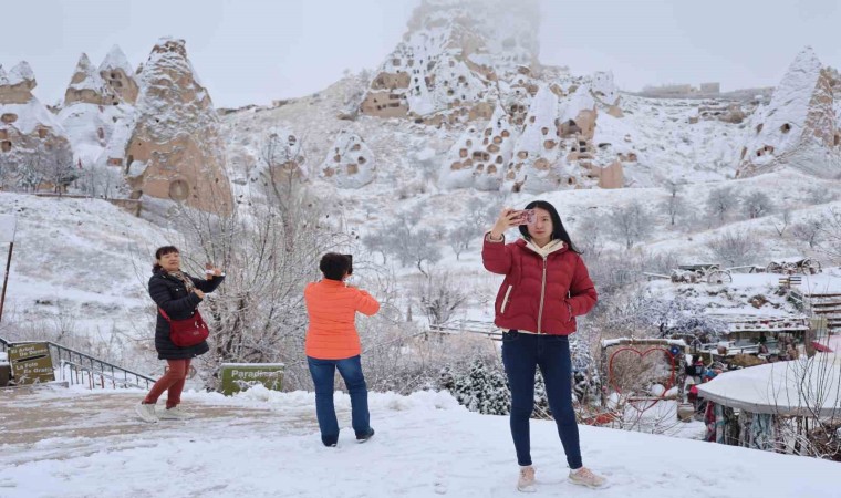 Peribacaları, doğal kaya oluşumları ve ilginç vadileri ile yerli ve yabancı turistlerin ilgi odağı olan Kapadokya, kar yağışı ile bir başka güzelliğe büründü. Göreme, Ürgüp, Zelve-Paşabağları, Çavuşin ve Uçhisar gibi bölgeleri ziyaret eden yerli ve yabancı turistler beyaz manzarayı fotoğrafladı. Kapadokya’ya gelen turistler, Uçhisar Kalesi’nin alt kısmında bulunan Cevizli Bağ vadisinden dünyanın en büyük gökdeleni olan Uçhisar Kalesi’ni izleyerek bol bol fotoğraf çektirdi.