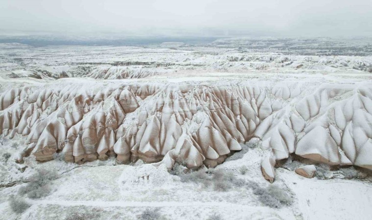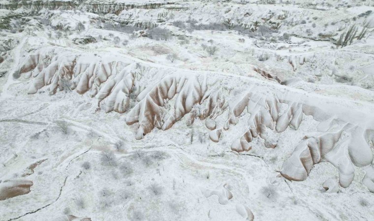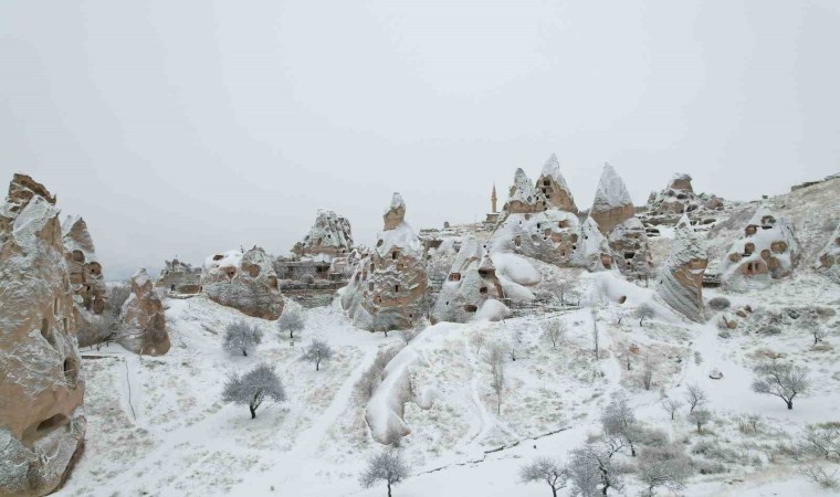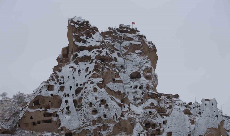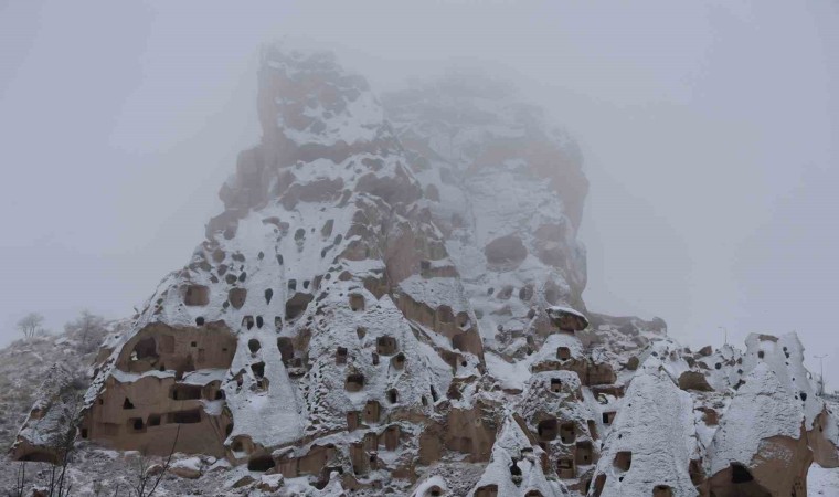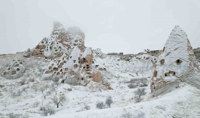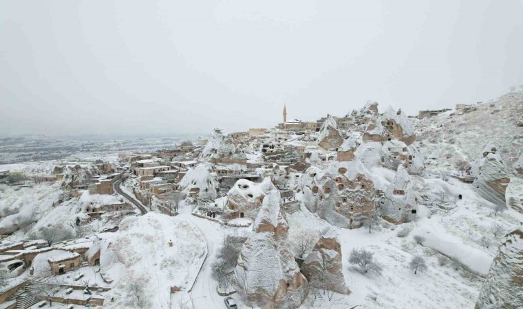 Nevşehir’de akşam saatlerinde başlayan ve aralıklarla devam eden kar yağışının ardından Kapadokya bölgesi beyaz örtüyle kaplandı. Yılda yaklaşık 5 milyon yerli ve yabancı turist ağırlayan Kapadokya bölgesi; kışın da turistlerin ilgi gösterdiği turizm destinasyonları arasında yer alıyor.