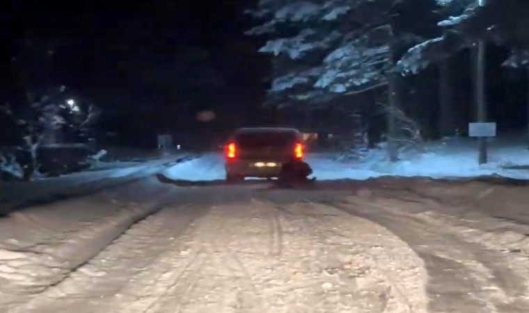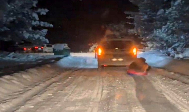Bolu’da karlı yolda aracın arkasına şambrel bağlayarak kayan vatandaşların tehlikeli anları kameraya yansıdı.
