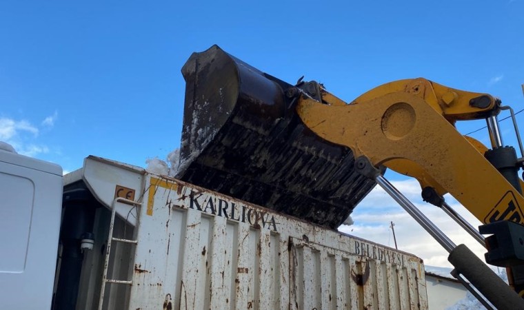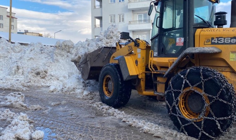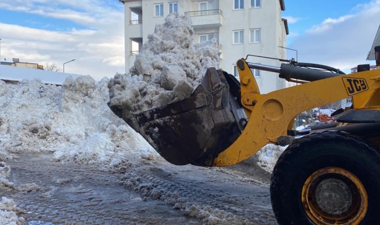 Bingöl’ün Karlıova ilçesinde belediye ekipleri, kepçe yardımıyla topladıkları karları kamyonlarla ilçe dışına taşıyor.