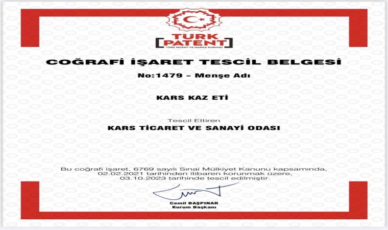 Kars Kaz Eti, Türk Patent ve Marka Kurumu tarafından, incelenen başvurular arasına girdi. İncelemelerin ardından 4 yıllık zorlu sürecin sonunda Ülkemizin en yüksek üretim sayısına sahip, kendine has lezzetiyle Türkiye’de meşhur olan Kars Kaz Eti 03.10.2023 tarihli ve 1479 Menşe no ile 02.02.2021 tarihinden itibaren coğrafi işaret tescili aldı.