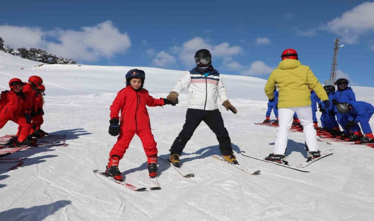 Karslı çocuklar, hem öğreniyor, hem de eğleniyor. Kayak yapmayı öğrenen çocukların sevinçleri yüzlerine yansıyor.