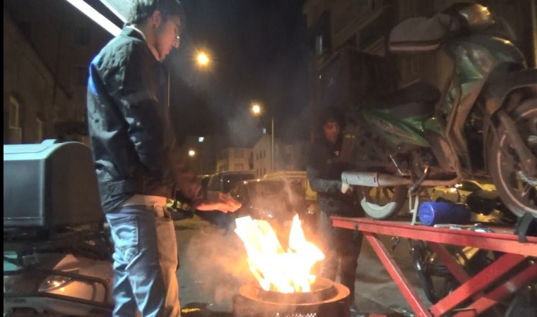 Öte yandan kentte motosiklet tamirciliği yapan bir vatandaş, iş yerinin önünde bidon içerisinde ateş yakarak hem çalıştı hem de ısındı.