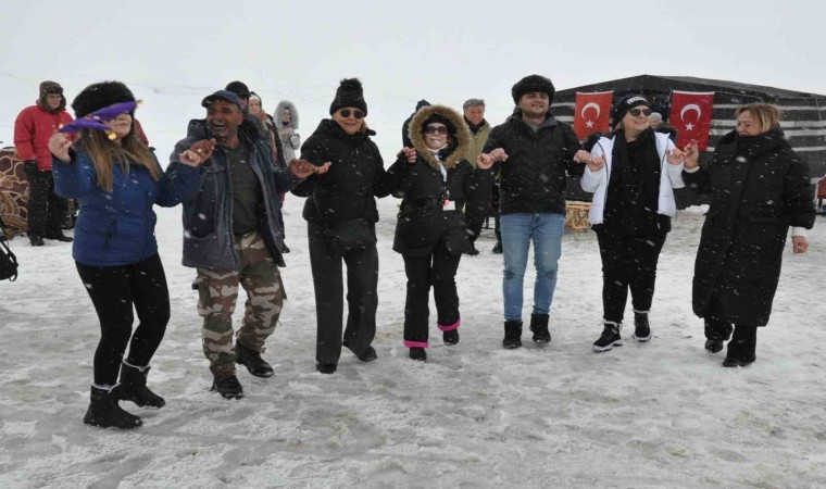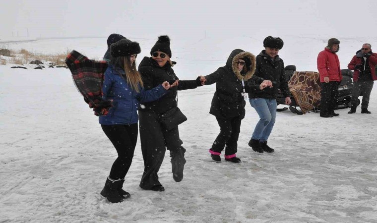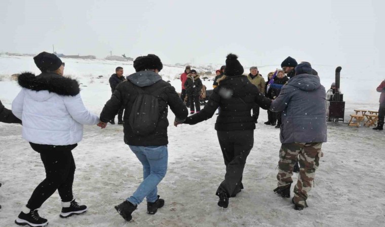 Kars’ta vatandaşlar, yüzeyi tamamen buz tutan Çıldır Gölü’nde Kafkas dansı yapıp halay çekerek gönüllerince oynadı.