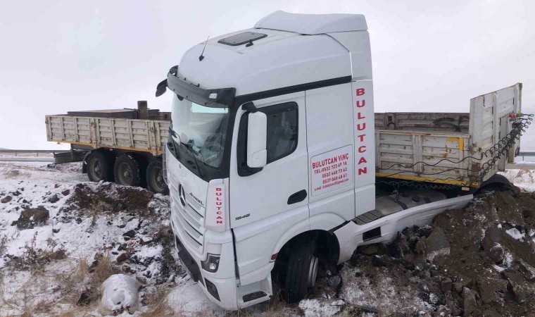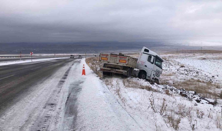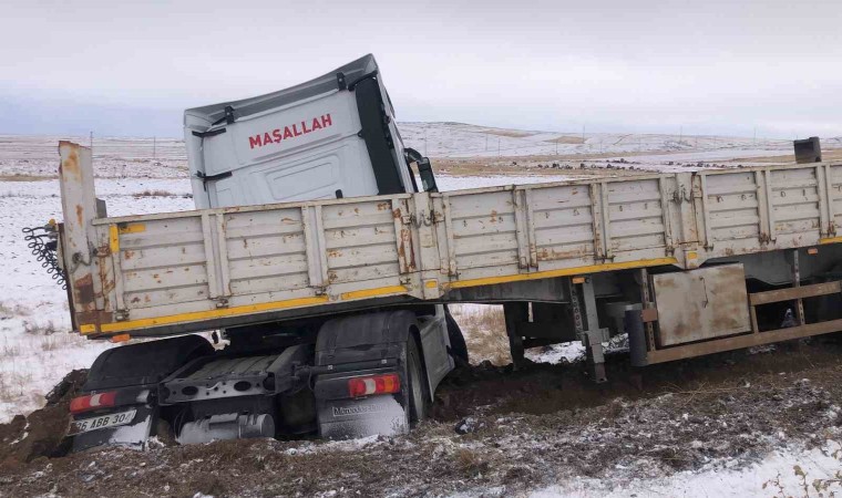 Kars’ta buzlu yolda kayan tır şarampole düştü. Kazada yaralanan olmazken, tırda maddi hasar oluştu.