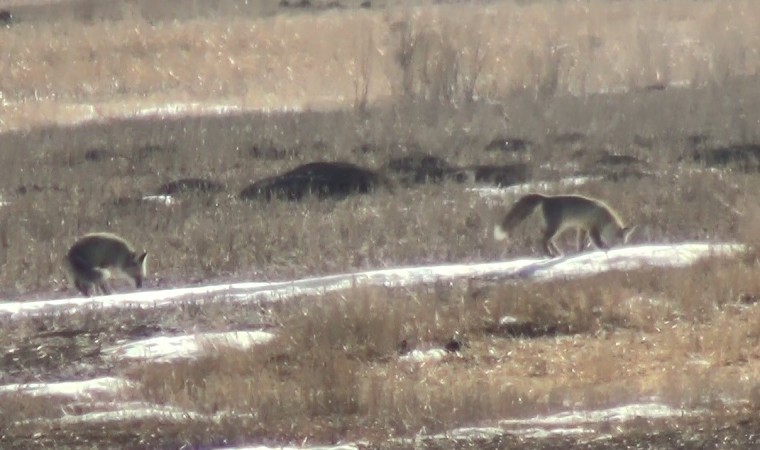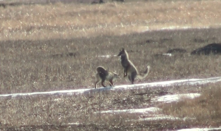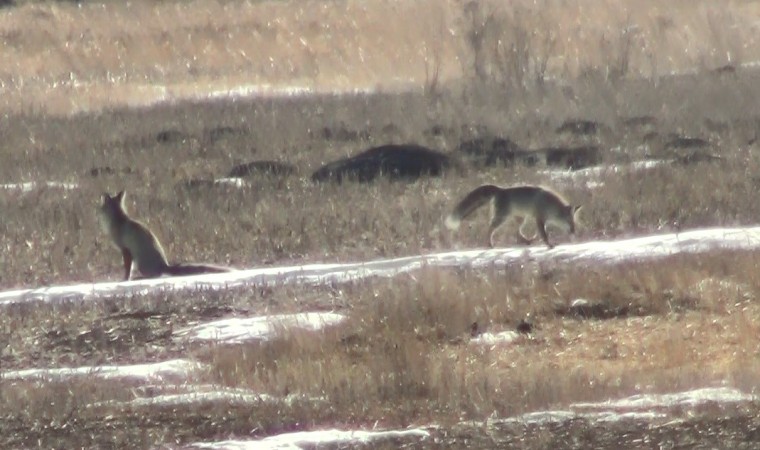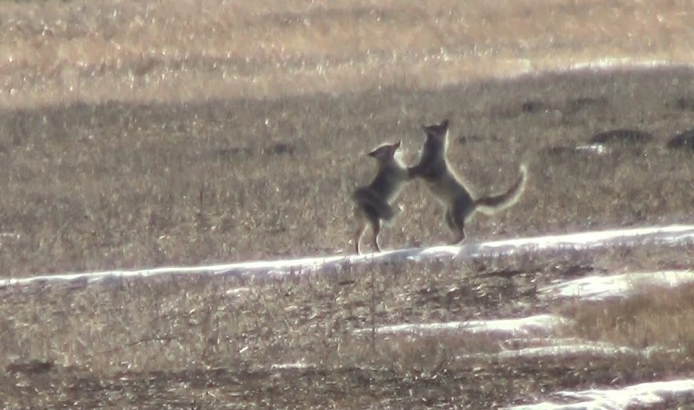 Kars merkez Cumhuriyet köyü bölgesinde arazide güneşli havada 2 tilkiyi gören vatandaş, o anları cep telefonuyla anbe an kaydetti.