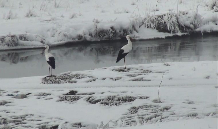 Kars’ta kış şartlarının etkisini göstermesiyle birlikte göç edemeyen leylekler, karla kaplı doğada görüntülendi. Kars Çayı’nın kenarında eksi 15 derece soğukta bölgeden ayrılmayan leylekler, çevredeki vatandaşların dikkatini çekti.