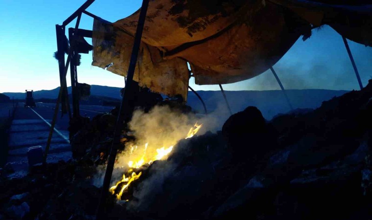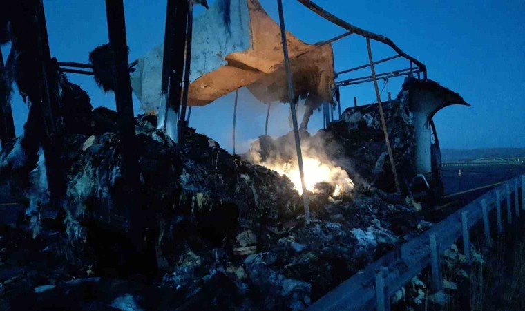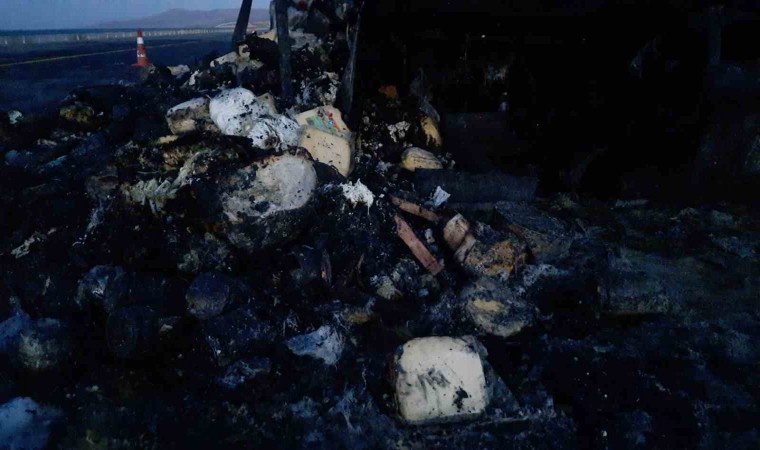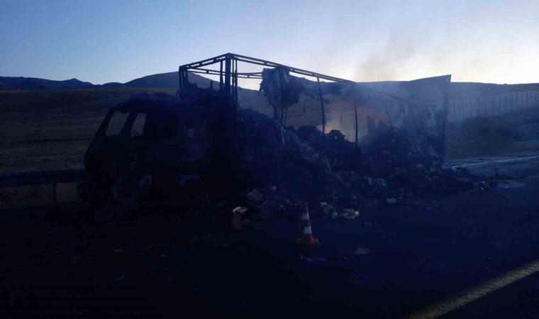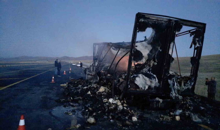Kars’ta hareket halindeki kamyon alev alev yandı. Tamamen yanan kamyon kullanılmaz hale geldi.