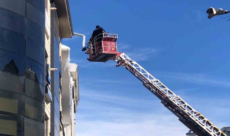 İtfaiye aracının merdiveni ile çatılara çıkan itfaiye erleri çevre güvenliğini aldığı binalarının buzlarını kırarak aşağıya döküyor.