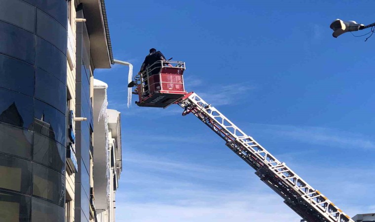 Kars Belediyesi İtfaiye Müdürlüğü ekipleri, kent genelinde özellikle ana arterlerde yaya yoğunluğunun olduğu bölgelerde çatılarda oluşan buz sarkıtlarını kırıyor