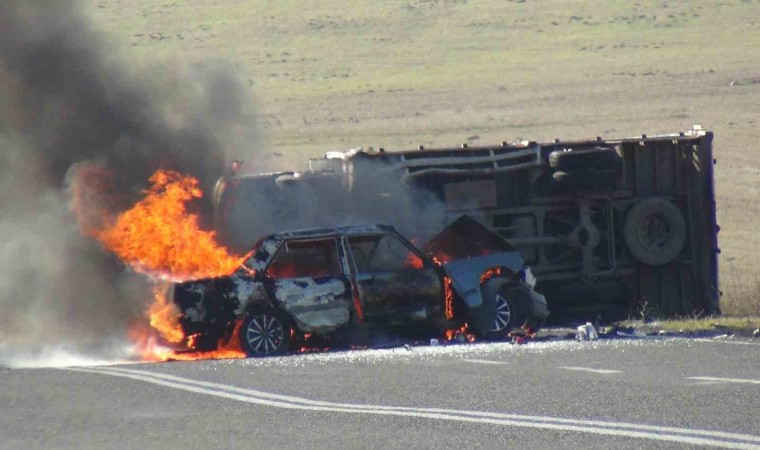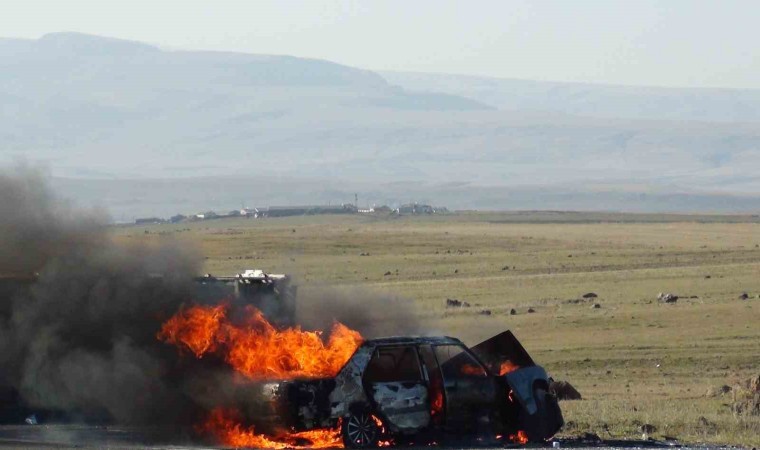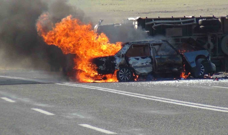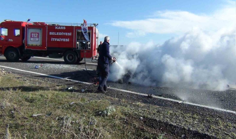 Kars’ta kamyonetle otomobilin çarpıştığı kazada, otomobil alev topuna dönüp yanarken, kamyonet ise yan yattı.