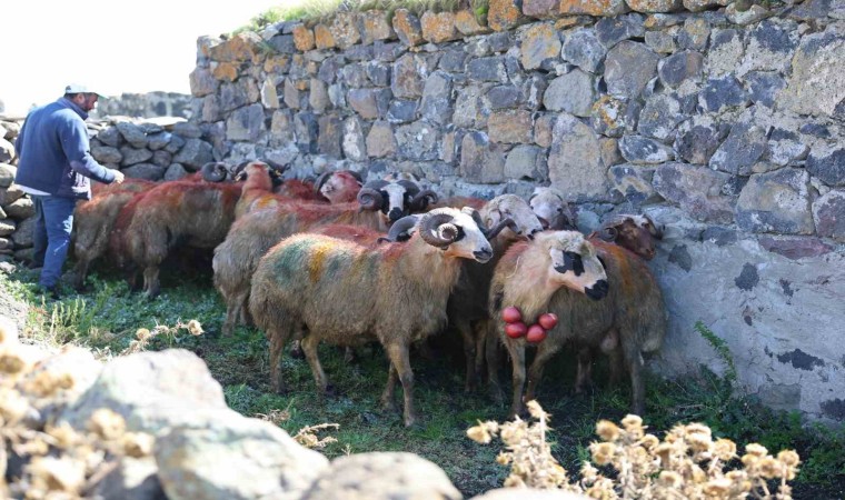 Kars’ta boyanan koçlar, boynuzlarına takılan elma ve şekerlemelerle sürüye katıldı.