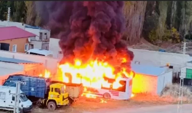Volkan KARABAĞ/ KARS, (DHA)- KARS'ın Susuz İlçe Belediyesine ait garajdaki halk otobüsü, alev alarak yandı. Otobüsün alev alev yandığı anlar, cep telefonu kamerasıyla kaydedildi.