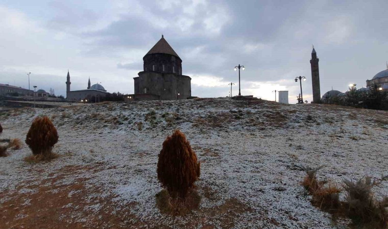 Kars’ta gece yağan karla beyaza bürünen tarihi yapılar kartpostal görüntüler oluşturdu.