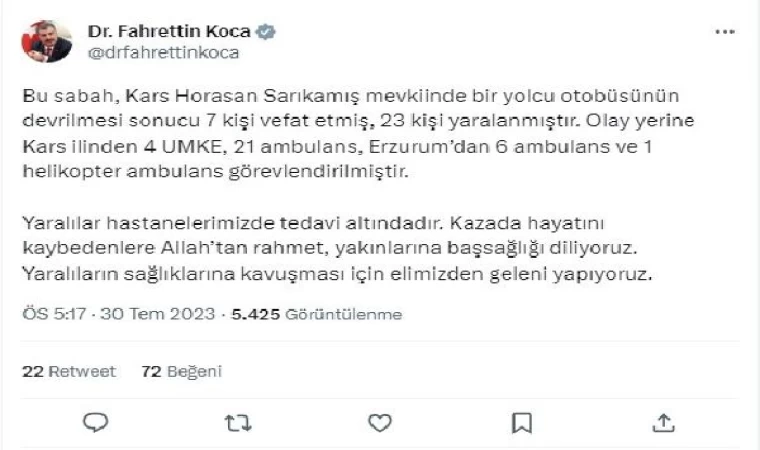 Sağlık Bakanı Fahrettin Koca, kazaya ilişkin sosyal medya hesabından açıklama yaptı. Koca, "Bu sabah, Kars Horasan Sarıkamış mevkinde bir yolcu otobüsünün devrilmesi sonucu 7 kişi vefat etmiş, 23 kişi yaralanmıştır. Olay yerine Kars ilinden 4 UMKE, 21 ambulans, Erzurum'dan 6 ambulans ve 1 helikopter ambulans görevlendirilmiştir. Yaralılar hastanelerimizde tedavi altındadır. Kazada hayatını kaybedenlere Allah'tan rahmet, yakınlarına başsağlığı diliyoruz. Yaralıların sağlıklarına kavuşması için elimizden geleni yapıyoruz" ifadelerini kullandı. (DHA)