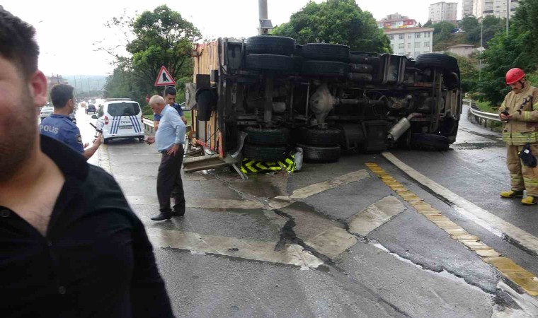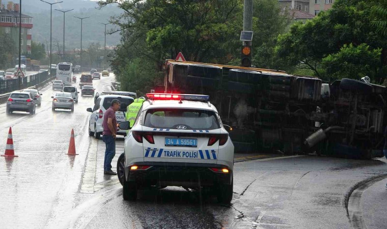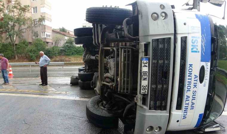 Kartal Samandıra TEM Bağlantı Yolu’nda yağmur nedeniyle kayganlaşan yolda virajı alamayan İSKİ’ye ait zift yüklü kamyon yan yattı. Kamyonda bulunan 3 kişi kazayı yara almadan atlattı.