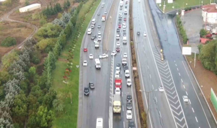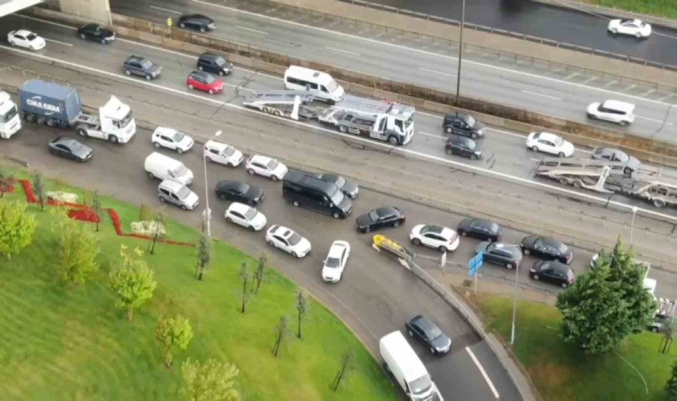 Kartal’da etkili olan yağış sonrası direksiyon hakimiyetini kaybeden sürücü yol üzerindeki aydınlatma direğine çarparak durabildi. Çarpmanın etkisiyle aydınlatma direği yola devrildi. Oluşan yoğun trafikten kaçmak isteyen araç sürücüleri ise ters yöne girerek trafiği tehlikeye attı. O anlar dron ile görüntülendi.