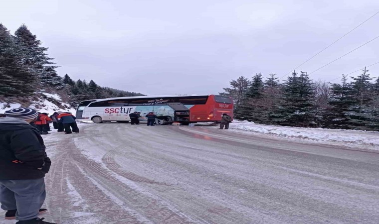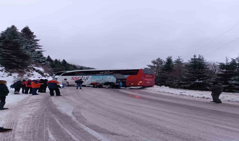 Bolu’da Kartalkaya Kayak Merkezi yolunda buzlanma nedeniyle kontrolden çıkan yolcu otobüsü, yolu ulaşıma kapattı. Onlarca araç yolda kalırken, otobüse zincir takılmasının ardından yol trafiğe açıldı.