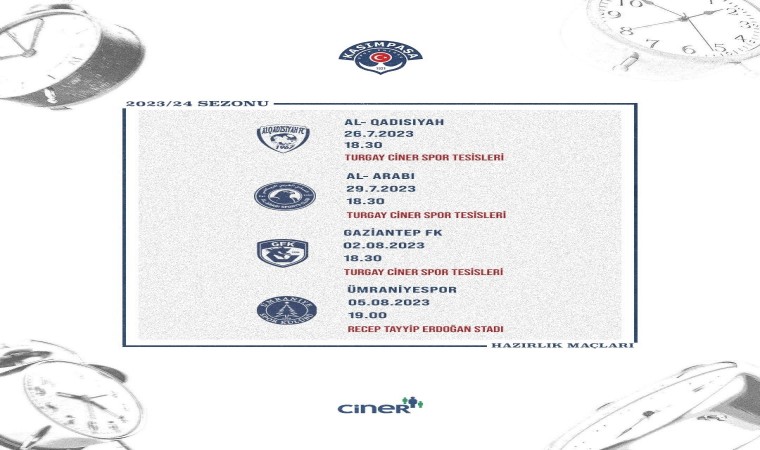 Trendyol Süper Lig ekiplerinden Kasımpaşa, gelecek sezon hazırlıklarına devam ediyor. Lacivert-beyazlılar, 2023-2024 sezonu öncesi oynayacağı hazırlık maçlarının programını açıkladı. 26 Temmuz Çarşamba günü Suudi Arabistan temsilcisi El Kadisiyah ile 18.30’da, 29 Temmuz Cumartesi Katar ekibi Al-Arabi ile 18.30’da, 2 Ağustos Çarşamba günü Trendyol Süper Lig temsilcisi Gaziantep FK ile 18.30’da Turgay Ciner Spor Tesisleri’nde oynayacak. Takvimin son hazırlık maçında 5 Ağustos Cumartesi günü Trendyol 1. Lig ekibi Ümraniyespor ile saat 19.00’da Recep Tayyip Erdoğan Stadyumu’nda karşı karşıya gelecek.