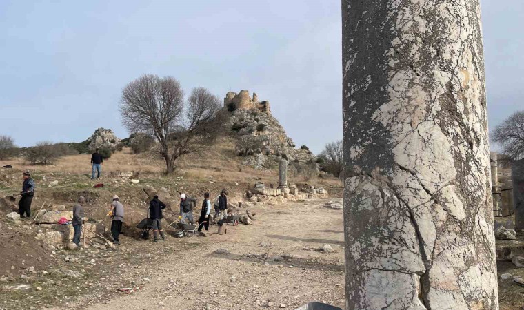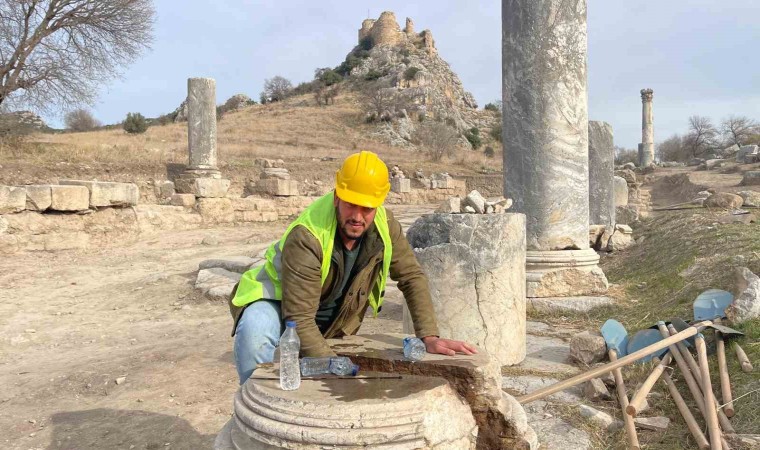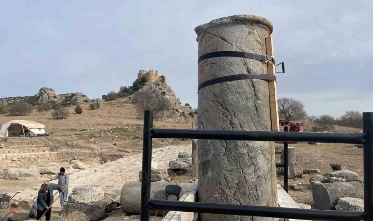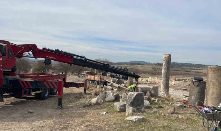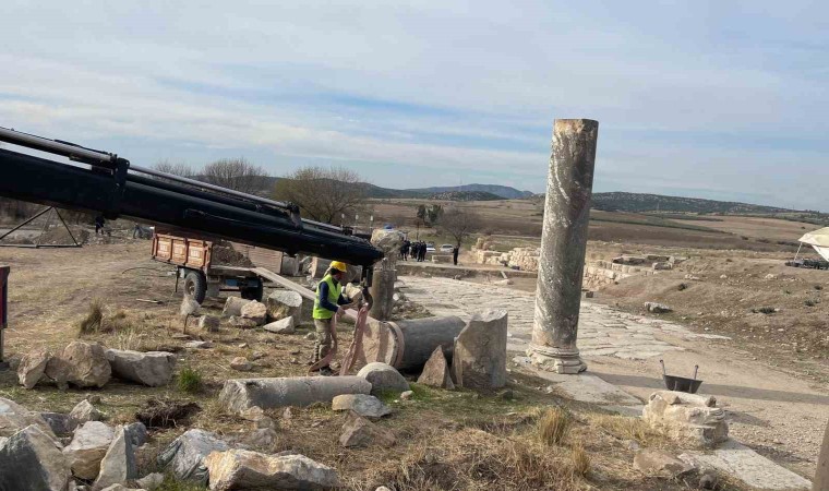 Osmaniye’deki Kastabala Antik Kenti’nde bulunan tarihi sütunlu caddede depremde hasar alan ve yıkılan sütunlar yeniden ayağa kaldırılıyor.