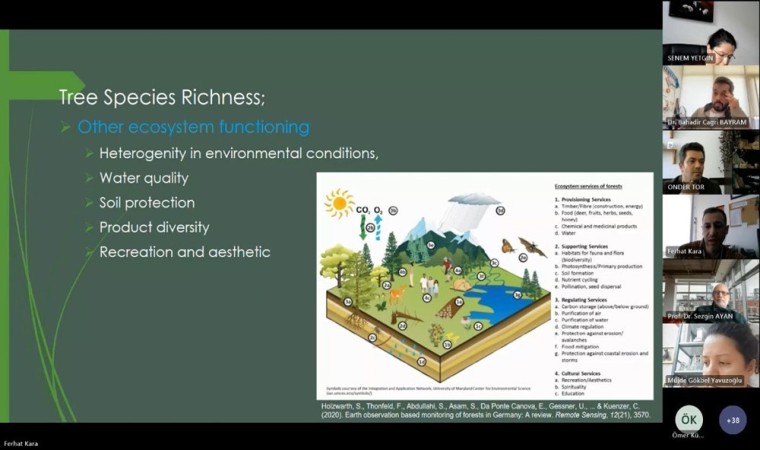 Doç. Dr. Kara, daha sonra ise orman ekosistemlerinde biyoçeşitlilk ve ağaç tür çeşitliliği konusunda orman biyoçeşitliliği sadece ağaçları değil, orman alanlarında yaşayan çok sayıda bitki, hayvan ve mikroorganizmayı ve bunlarla ilişkili genetik çeşitliliği de kapsadığını, biyolojik çeşitliliğe sahip ormanların değişen çevresel şartlarına adaptasyonda genellikle daha başarılı olduklarını, bir ormandaki yaşamın çeşitlilik ve karmaşıklık düzeyi, orman ekosistemlerinin insanlar için sağladığı ürün ve hizmetlerin devamlılığı açısından önemli olduğuna vurgu yaptı.