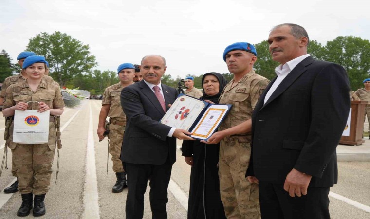 Jandarma Genel Komutanı Orgeneral Arif Çetin ise, “Şanlı Türk tarihine adını altın harfler ile yazdıran vatan ve bayrak aşkını yüreğine nakşeden, şanlı bayrak uğruna şahadete yürümekten bir an bile tereddüt etmeyen kahraman komandolar, bu kutsal göreve talip oldunuz. Vatan hizmetine koşmaya hazır binlerce genç arasından titizlikle seçildiniz. Zorlu hava şartlarında, fiziki yeterliliğe sahip ve gelişmiş, disiplinli ve görev anlayışı yüksek birer Jandarma Komando olmak amacıyla buraya geldiniz. 6 ay süresince geçirilen zorlu eğitim sonrası 2 bin 377 kişi olarak uzman erbaş Komando kursunu başarıyla tamamladınız. Hepinizi tebrik ediyor, kutluyorum. Yüce milletimizin engin sevgi ve güvenine mazhar olmuş, kahraman Jandarma Genel Komutanlığında görev yapmaya hak kazandınız. Hepinizi canı gönülden tebrik ederken bu süreçte emeği geçen eğitici personellerin tamamını, buradaki komutanları, idari personeli, öğretmenleri ve katkıda bulunan tüm idari personellerini kutluyorum, tebrik ediyorum, teşekkür ediyorum. Sizler Türkiye Cumhuriyetinin inançlı, azimli ve her an göreve hazır bir kanun ordusu olan teşkilatımızın onurlu birer Jandarma Komandosu olarak birliklerinize gideceksiniz. Katıldığınız bu saflar, vazifesini namus bilip makamların en büyüğü olan şehadet makamına koşanların alın teriyle yoğrulmuştur. Taşıdığınız üniformanın yüce Türk milletinin şeref timsali olduğunu yurdun en ücra köşesinde bile bu üniforma ile Jandarma Genel Komutanlığını temsil ettiğinizi asla unutmayın. Atalarımızın yadigarı, şehitlerimizin emaneti, gazilerimizin vasiyeti bu güzel vatanımız sizlerin omuzlarında daima yükselecek, şanlı bayrağımız bu kutsal vatan topraklarında sonsuza kadar dalgalanacaktır. Sizler yalnızca terör ile mücadele değil emniyet ve asayişin sağlanmasının yanı sıra halkımızın ihtiyaç duyduğu her an her yerde başta deprem, yangın, sel, çığ gibi doğal afetlerde yardım ve kurtarma görevini de icra edeceksiniz. Halkın yedi gün yirmi dört saat yanında, yakınında ve emrine amade olacaksınız. Halka hizmet hakka hizmet düşüncesi ile görevimizi icra edeceğiz. Yüce milletimizin daima emrinde olacağız” diye konuştu.