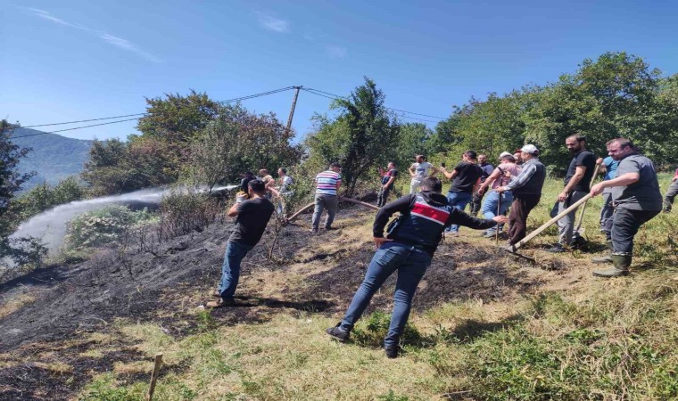 Çıkan yangında yaklaşık 1 dönüm alan zarar görürken jandarma ekipleri, bölgede güvenlik önlemleri alarak incelemelerde bulundu.
