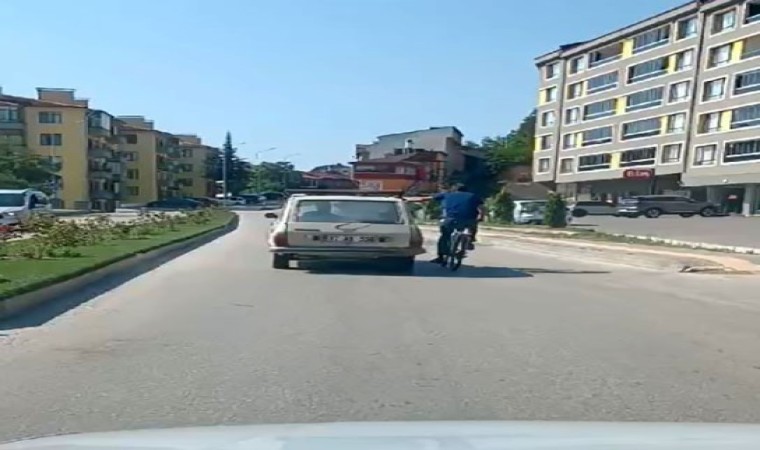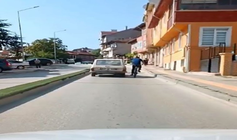 Kastamonu’da İsmailbey Mahallesi İnebolu Caddesi’nde meydana gelen olayda, rampayı çıkamayan bir bisiklet sürücüsü, yanında seyir halinde olan bir otomobilden tutunarak ilerlemeye çalıştı. Metrelerce otomobilden tutunarak ilerlemeye çalışan sürücü, ölüme davetiye çıkardı. Duruma tepki gösteren vatandaşlar ise o anları cep telefonu ile görüntüledi.